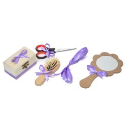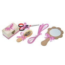 Tavita pentru mot include: Tavita din lemn, foarfeca, perie de par, oglinda, cutiuta pentru pastrarea suvitei de par, fundita pentru legarea suvitei de par.